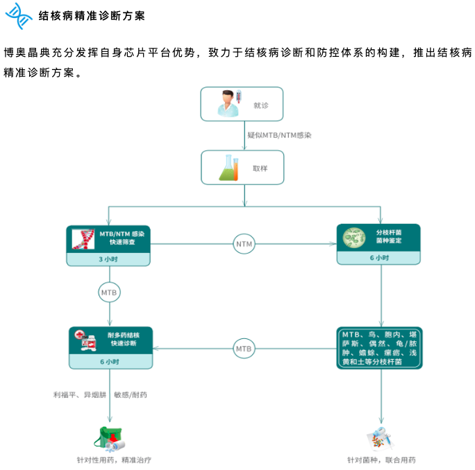 结核病精准诊断方案中包含:分枝杆菌核酸检测试剂盒(PCR-荧光探针法)、分枝杆菌菌种鉴定试剂盒(DNA微阵列芯片法)、结核分枝杆菌耐药基因检测试剂盒(DNA微阵列芯片法)。这三款诊断产品,环环相扣,涵盖了结核快速筛查、菌种鉴定、耐多药结核病快速诊断,构成了晶芯®结核病快速分子诊断系统。结核诊断、辅助用药全面覆盖,真正实现结核全程分子监控。